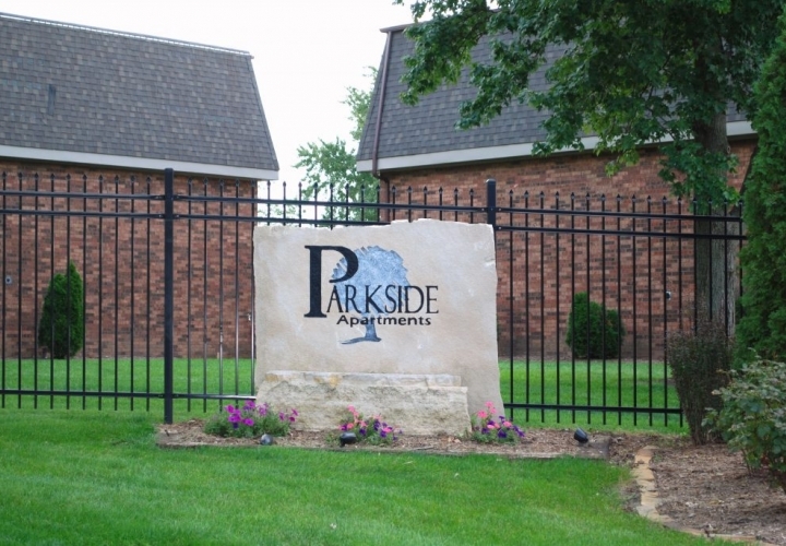 Entrance monument sign for Parkside Apartments in Urbana, IL, set against a neatly landscaped lawn with vibrant flowers and secure fencing. The stone monument proudly displays the Parkside Apartments logo, welcoming residents to a quiet and well-maintained community.