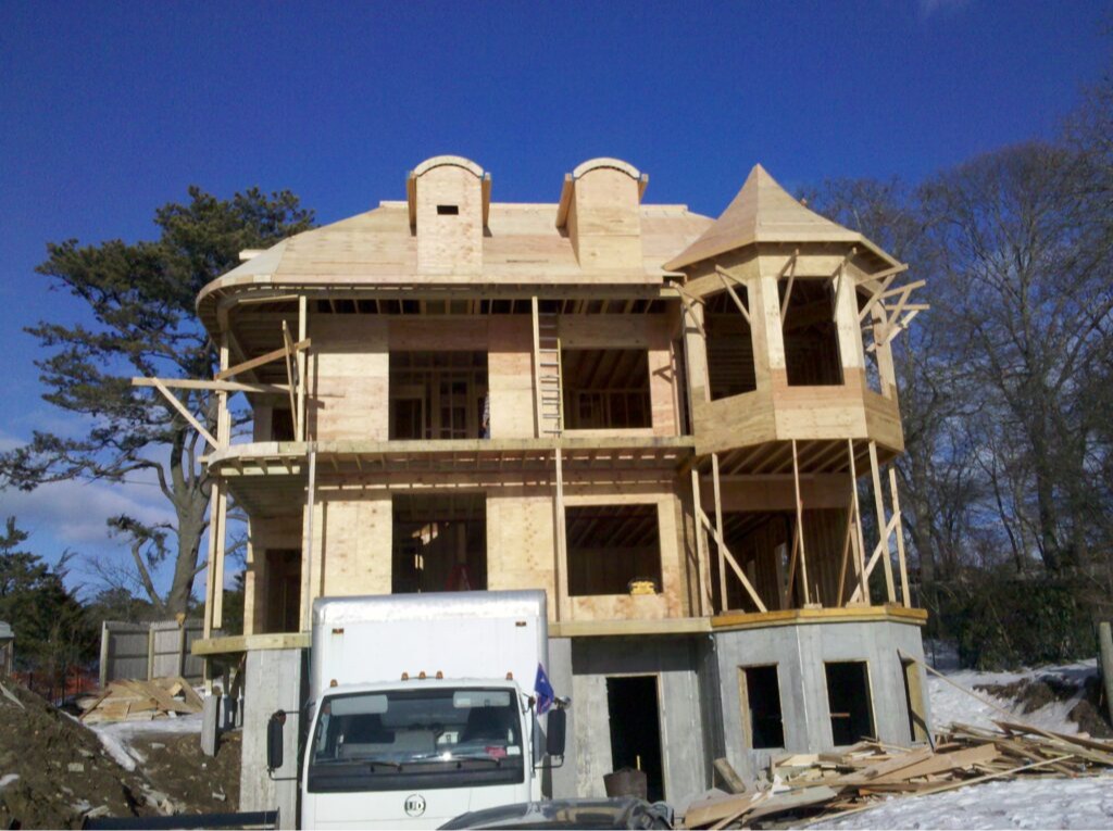 A large custom home under construction with full exterior framing and roof structure being built by a Suffolk County general contractor.