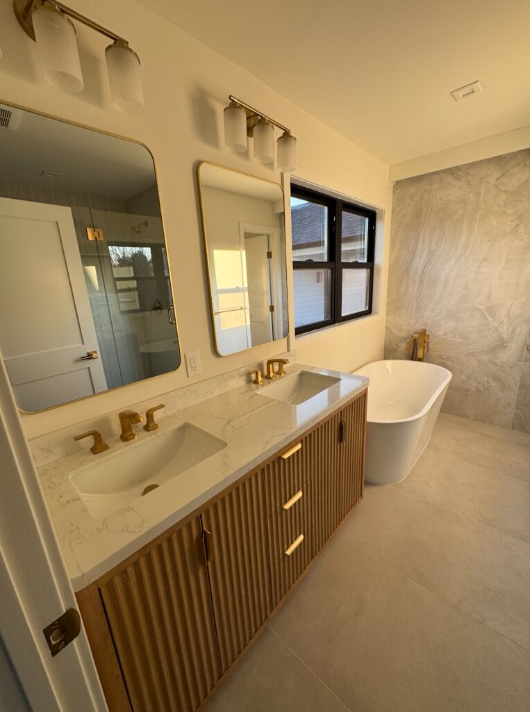 A luxury bathroom renovation with double vanity, gold fixtures, quartz countertops, tile flooring, and a freestanding bathtub in Suffolk County, NY.