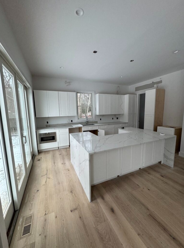 A bright new kitchen installation with white shaker cabinets, large waterfall island, light wood floors, and natural lighting from sliding glass doors.