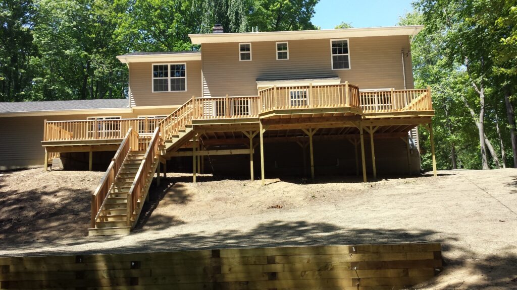 A multi-level elevated wood deck with stairs and railings built onto the back of a home surrounded by trees in Suffolk County, NY.