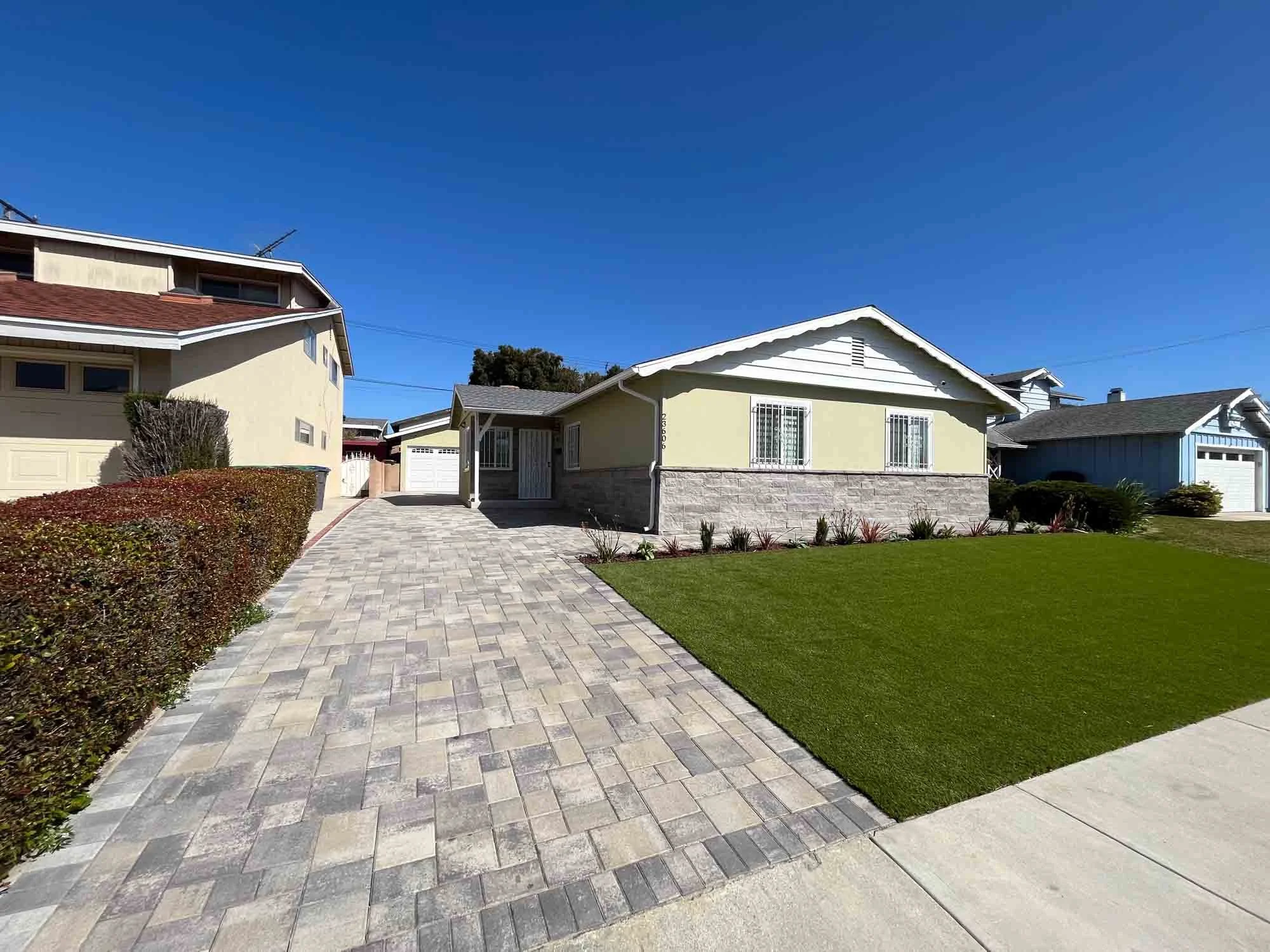 A newly renovated house with a modern, block-paved driveway leading to the garage. The front yard features a tidy, artificial grass lawn and a stone veneer on the lower half of the house's exterior.