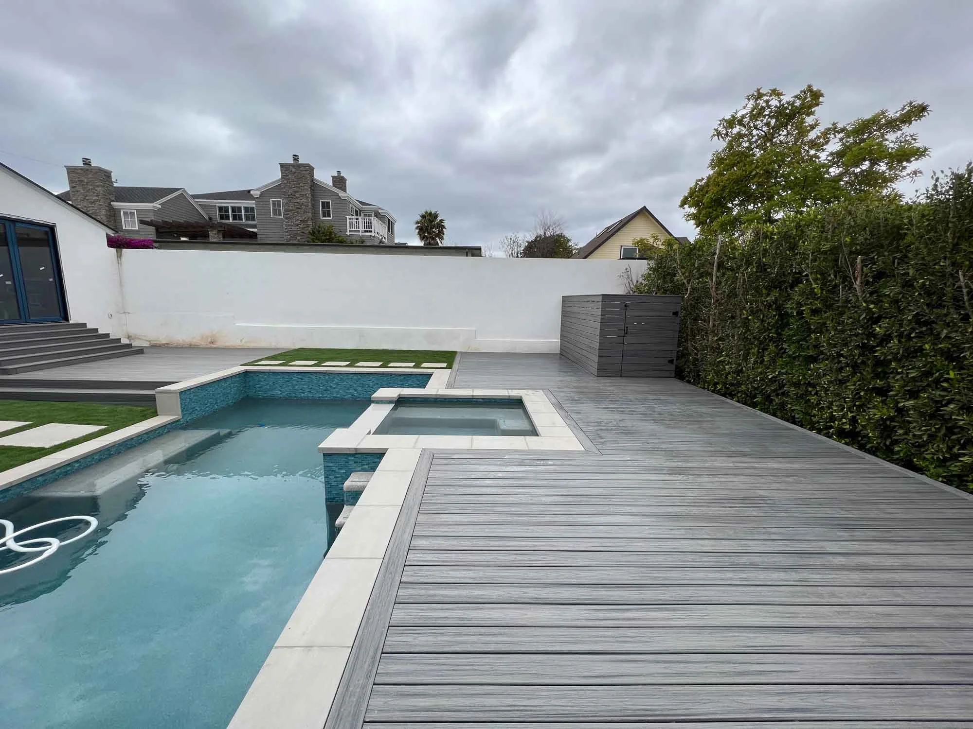 A finished backyard features a gray composite deck surrounding a swimming pool with an attached spa. The modern design includes a clean white privacy wall and lush green hedges, with a cloudy sky overhead.