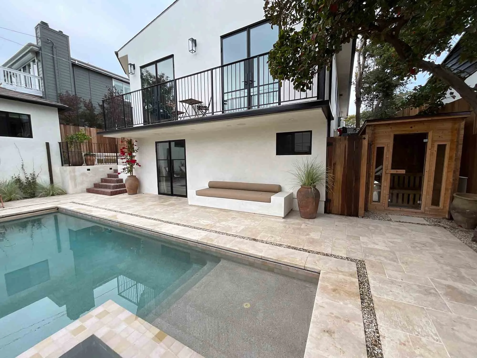 A home's outdoor area with a modern, rectangular swimming pool surrounded by beige tile paving. The space includes a built-in outdoor couch and a wooden sauna cabin, creating a resort-like atmosphere.