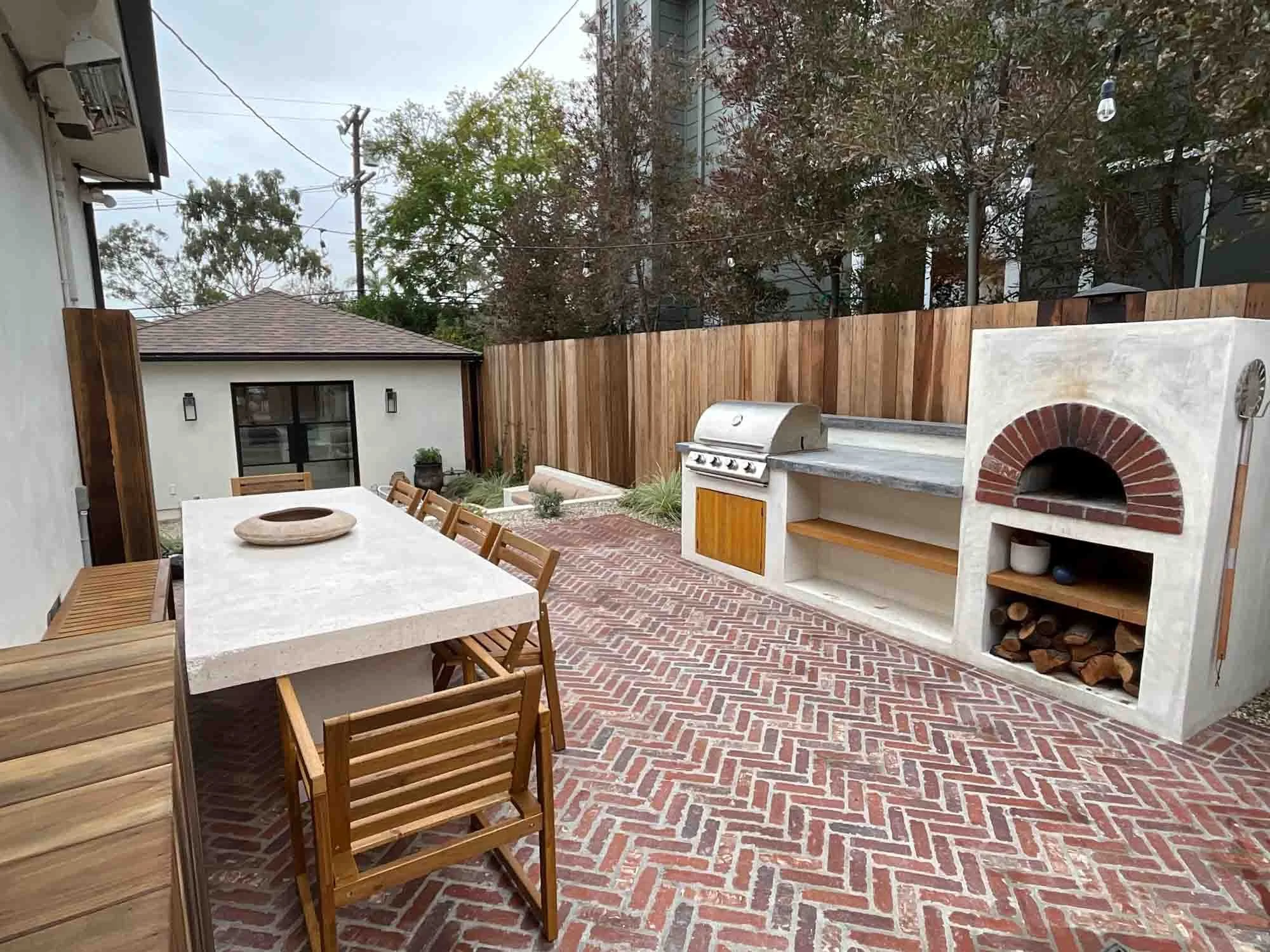 A beautifully designed outdoor patio features a herringbone-patterned brick floor. The space is set up for dining and cooking with a long concrete table, a built-in grill, and a rustic brick pizza oven.