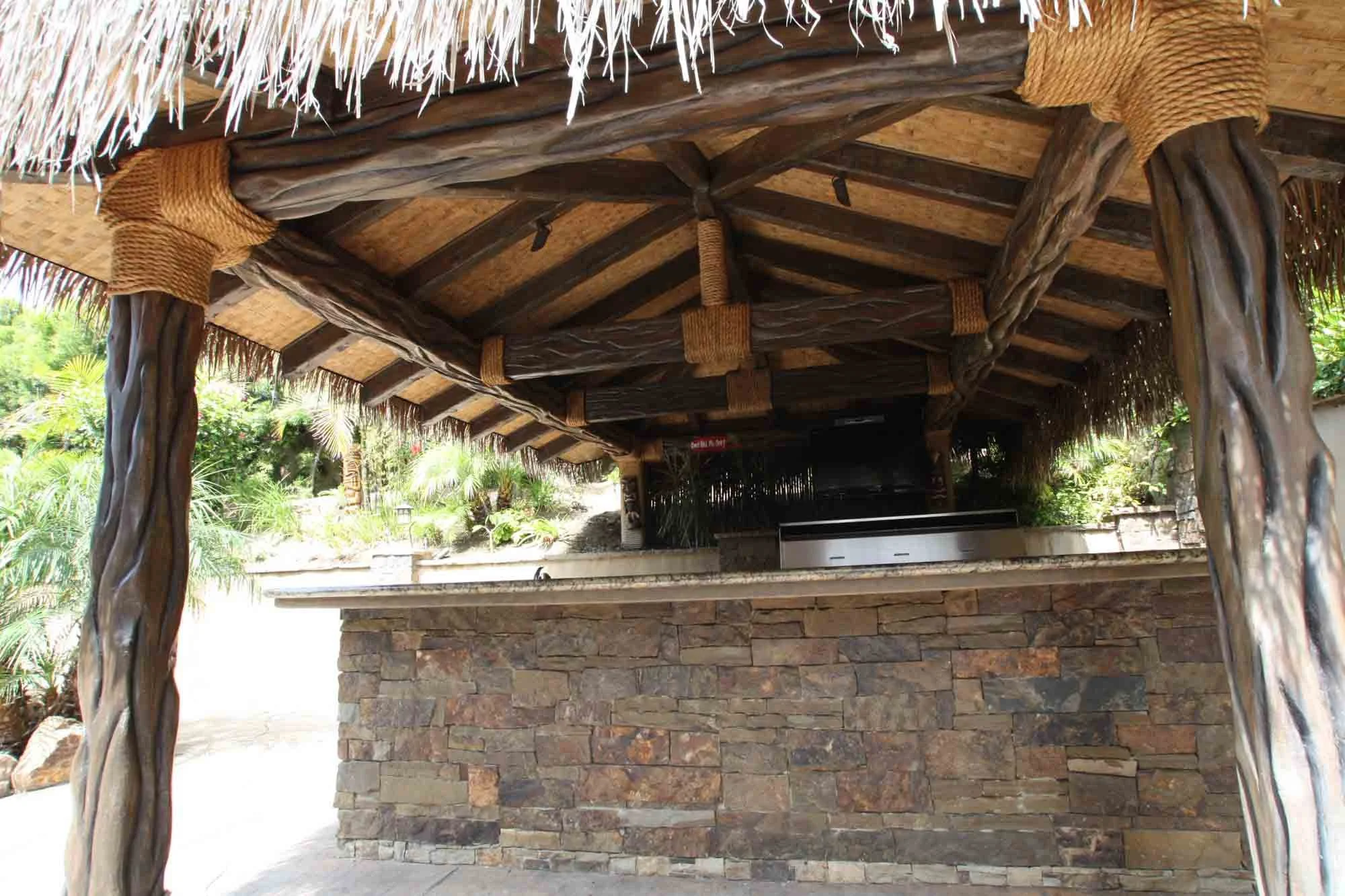 A tropical-themed outdoor bar with a thatched roof supported by textured, wood-like columns wrapped in rope. The counter features a stone base and is equipped with a modern stainless steel grill.