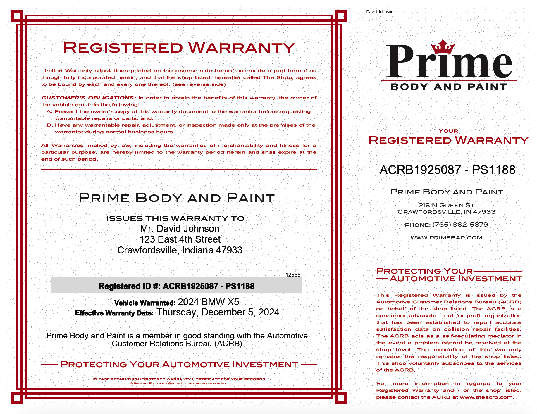 Prime Body and Paint in Crawfordsville – Registered Warranty Certificate at Prime Body and Paint