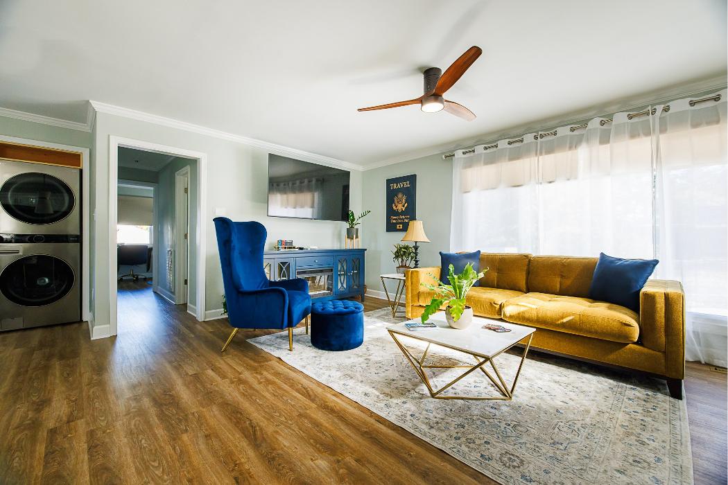 The Sapphire at Sandymount | Serene Boutique Home in Fayetteville, NC. Cozy yet luxurious 2BR stay featuring hot tub, putting green. Great for family visits to military, or events near the airport. Privacy over hotel hassle!