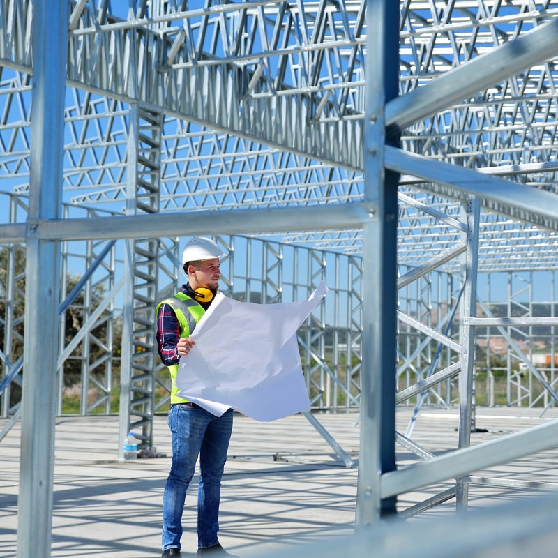 A professional architect reviews blueprints inside a modern industrial facility, emphasizing precision, design expertise, and attention to detail in large-scale commercial construction and engineering projects.