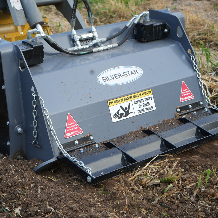 Mini roto tiller for small-scale soil tillage. Perfect for gardens and landscaping with mini skid steers.