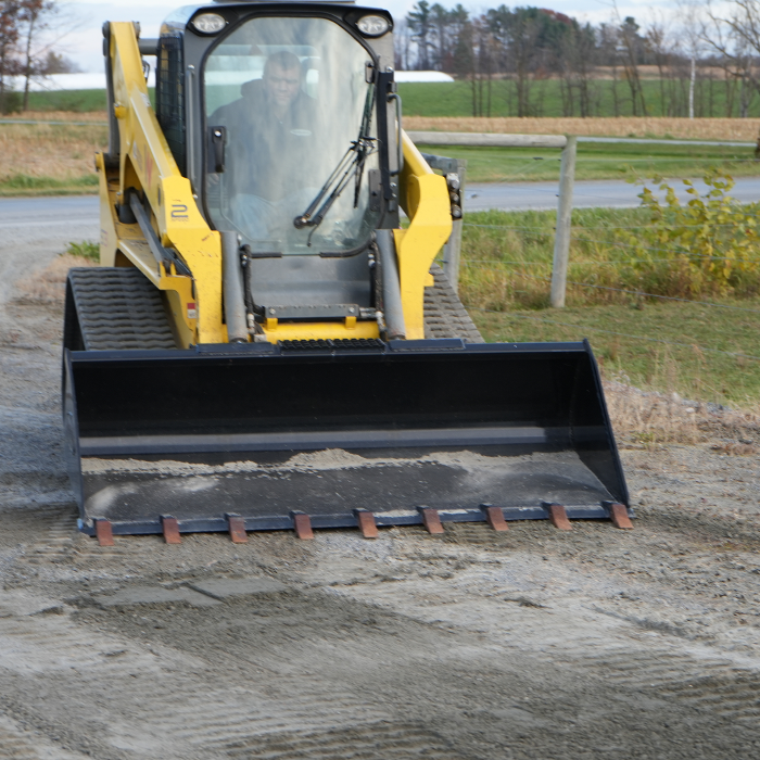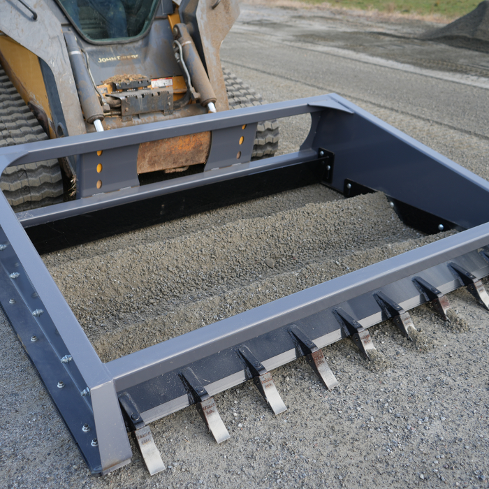 Skid steer driveway grader for leveling gravel and dirt roads. Maintains smooth surfaces with adjustable, durable design.