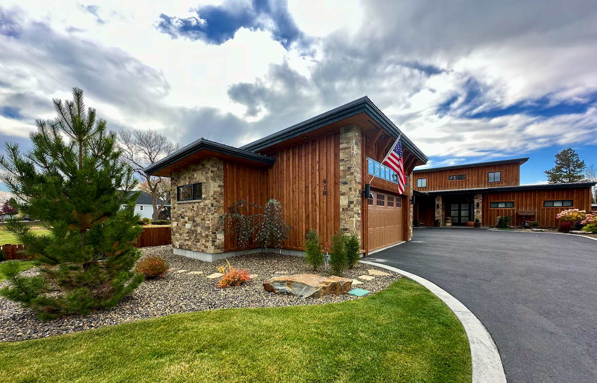 This custom-designed Modern Farmhouse by South Fork Design showcases a striking exterior with dark siding, warm wood accents, and large windows that frame the Teton mountain views. The 2,272 sq. ft. main home features an open living space, while a separate 766 sq. ft. apartment provides a private retreat for guests. The property is complete with a 3-car garage, an expansive driveway, and a spacious lawn, perfectly blending sophisticated design with the functionality required for mountain living.
