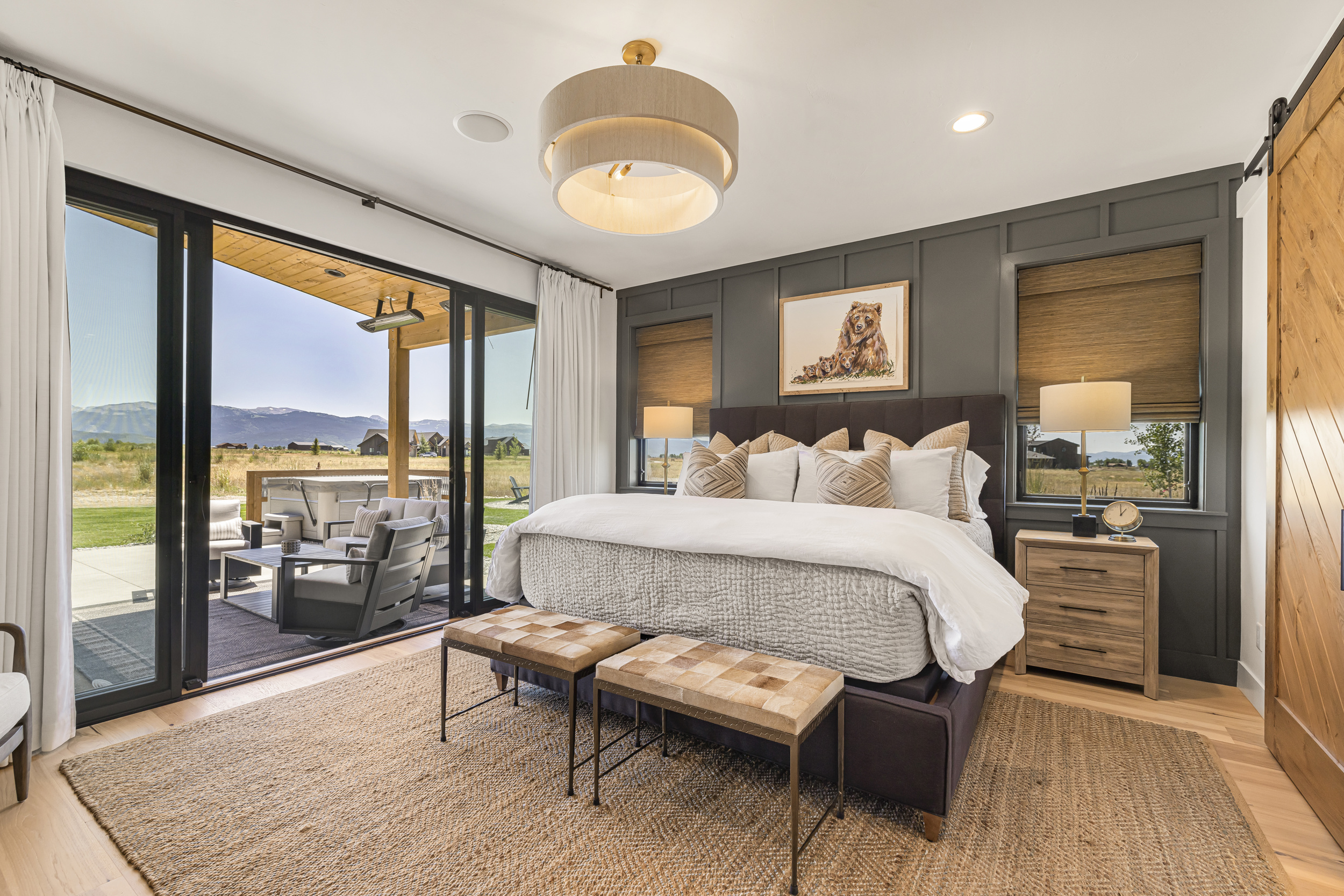This inviting master suite, part of the Modern Farmhouse with Teton Views by South Fork Design, offers a luxurious retreat designed for comfort and scenic beauty. The room features a sophisticated dark accent wall with paneling, a plush bed adorned with layered textures, and elegant nightstands with lamps. A striking modern light fixture enhances the room's ambiance. Crucially, expansive sliding glass doors open directly to an outdoor patio, seamlessly blending indoor and outdoor living and providing breathtaking Teton mountain views, perfect for unwinding after a day of mountain adventures.