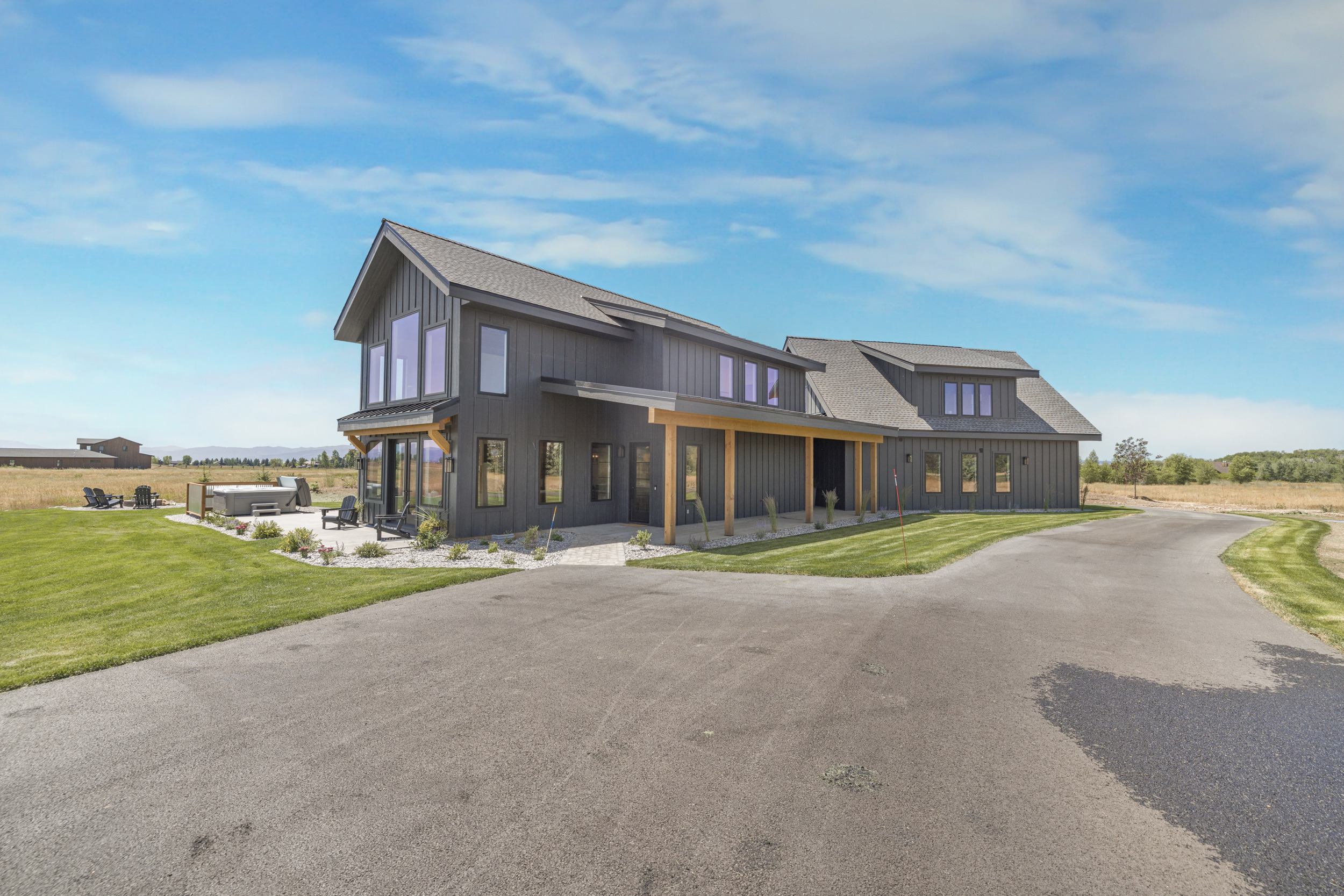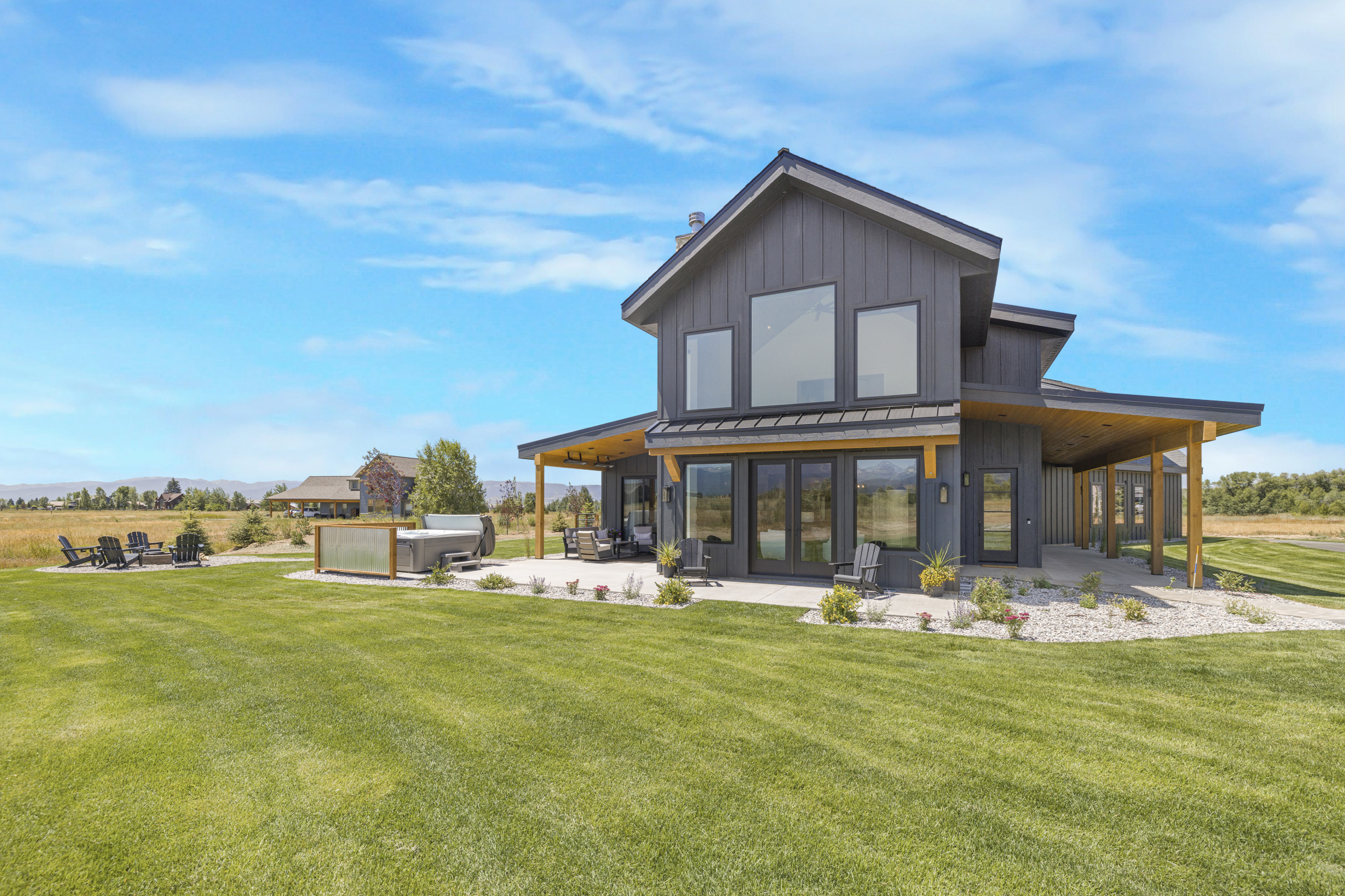 The rear view of the Modern Farmhouse by South Fork Design highlights its seamless integration of indoor and outdoor living. An expansive covered patio provides a sheltered space for entertainment and relaxation, accessible directly from the home's open-concept living area through large glass doors. This outdoor oasis, featuring a hot tub and multiple seating areas, is perfectly positioned to capture the unforgettable Teton mountain views, making it an ideal extension of the 2,272 sq. ft. main home.