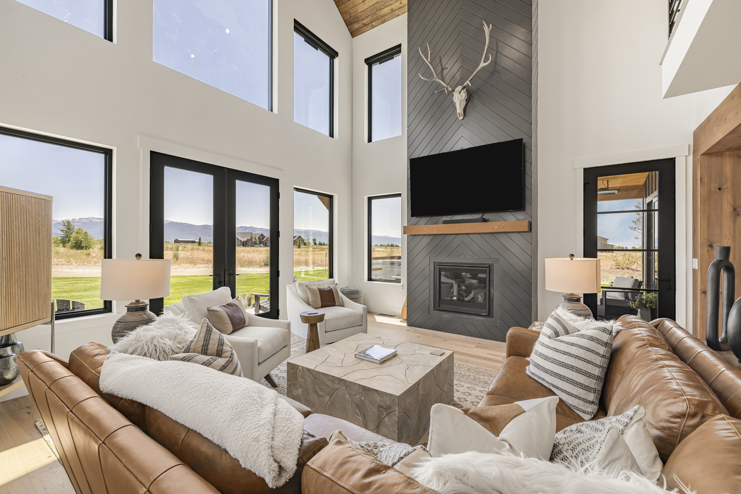 The heart of the Modern Farmhouse with Teton Views is this stunning open living space by South Fork Design. Soaring ceilings and a two-story wall of windows flood the room with natural light, perfectly framing the spectacular mountain landscape. A dramatic floor-to-ceiling fireplace with a dark herringbone pattern serves as a modern focal point, while comfortable leather and fabric furnishings create an inviting atmosphere. This space epitomizes the home's design for everyday living and unforgettable Teton moments.