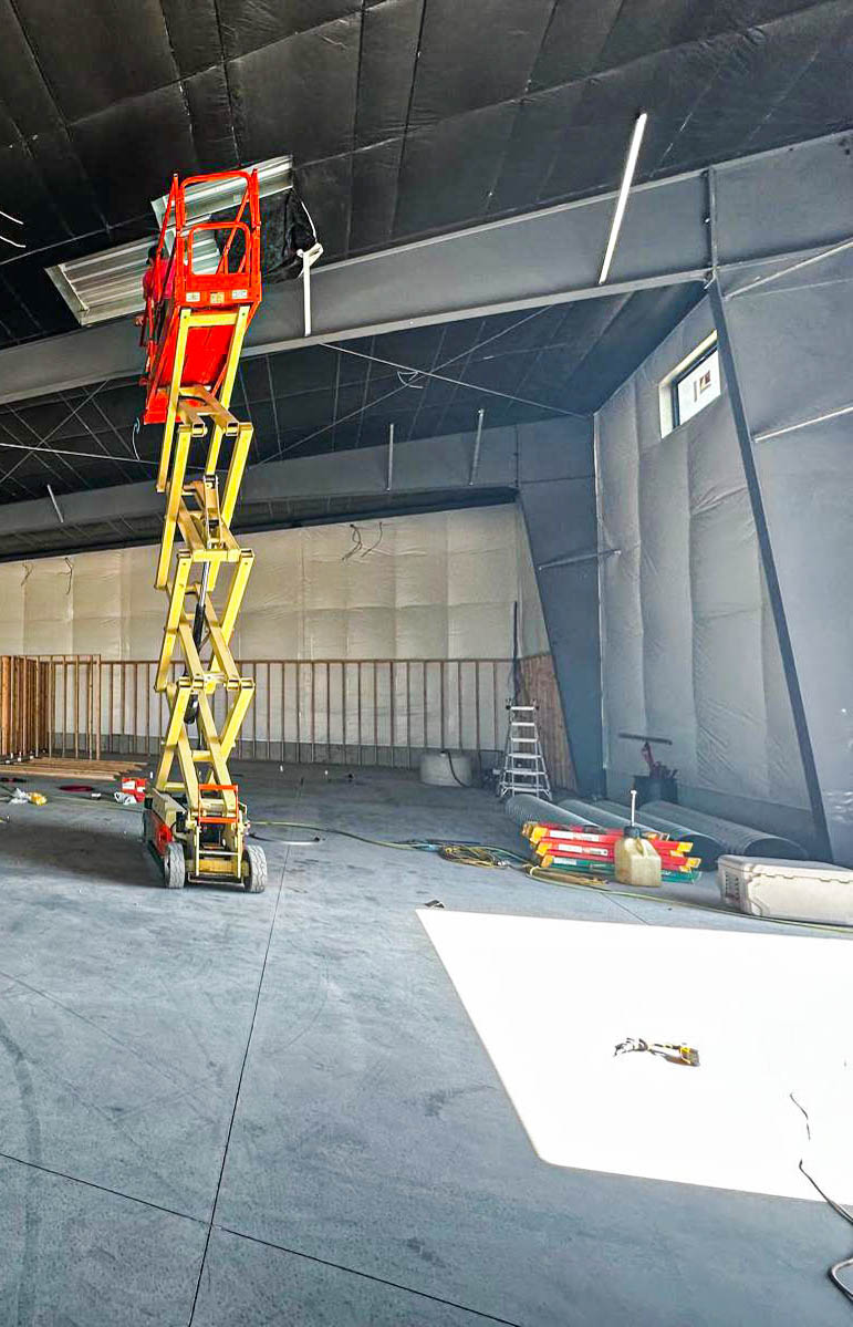This image provides a layered view of the progress at the Fit One facility. The foreground details the construction of interior headers and soffits, showcasing the precision of our wood framing work. In the background, the high-R-value blanket insulation lines the steel building envelope, ensuring energy efficiency. The presence of essential heavy equipment, like a boom lift and telehandler, highlights Steel Concept Inc.'s capability to manage all facets of a commercial building project.