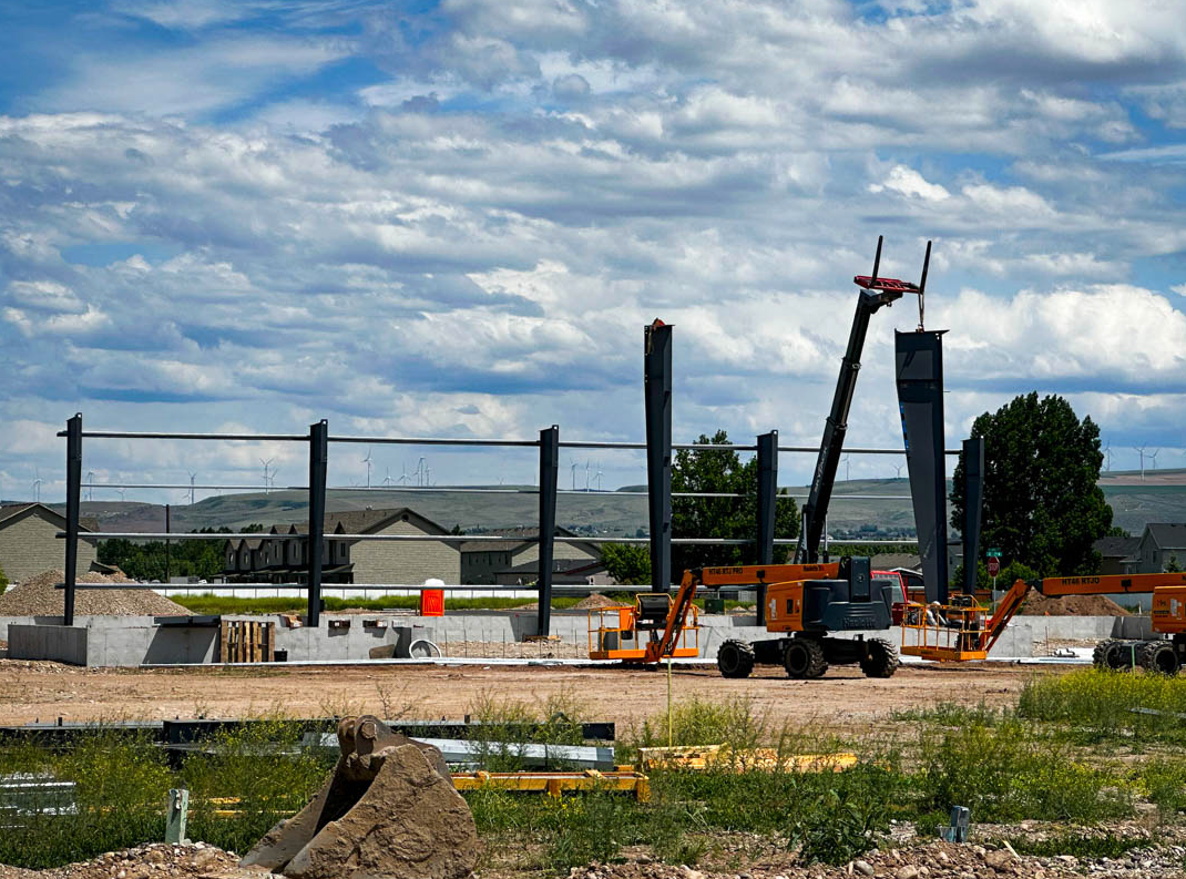 This image showcases a Steel Concepts building project underway, with the initial steel frame taking shape against a wide-open sky. Our skilled crews are shown using specialized heavy machinery to erect the primary columns and begin installing horizontal supports. This demonstrates our expertise in managing large-scale construction for pre-engineered steel buildings, which are ideal for commercial, industrial, and agricultural applications. We handle all aspects of the build with a focus on safety, structural integrity, and project timelines.