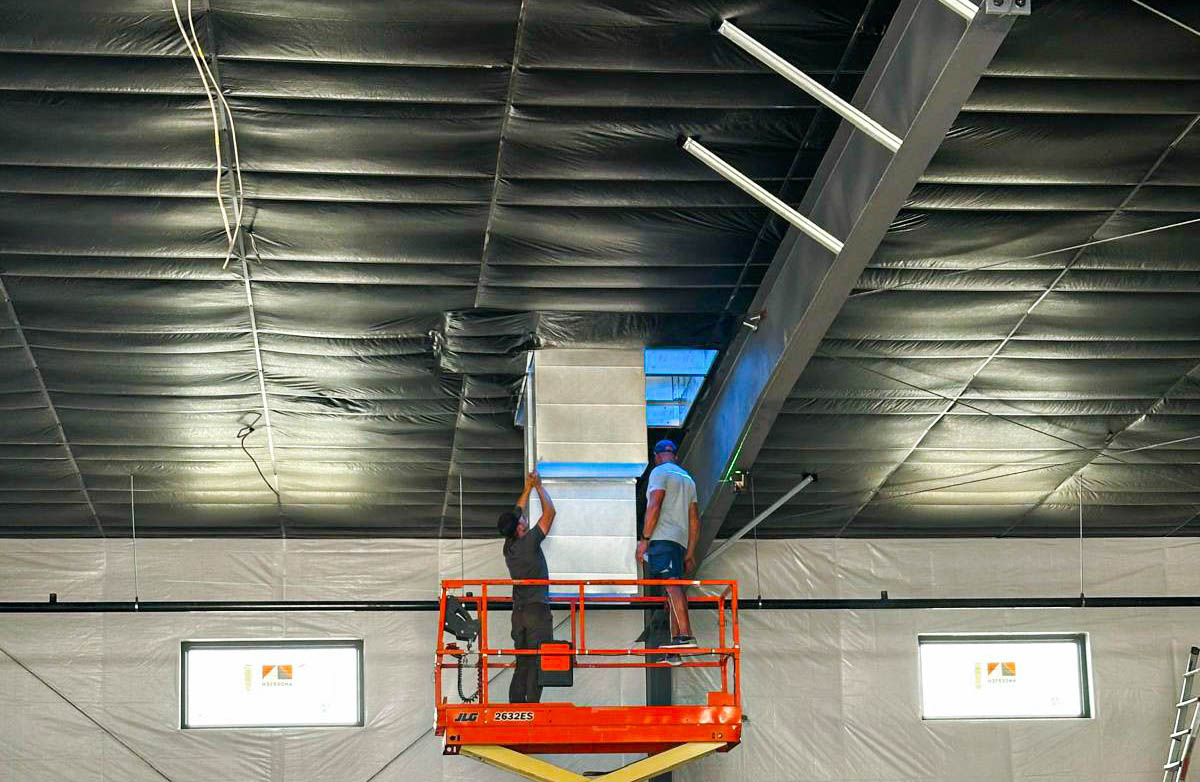 This image details the technical work involved in a commercial steel building fit-out. Our team is shown integrating the HVAC system directly through pre-engineered openings in a primary structural I-beam. This process, part of the mechanical, electrical, and plumbing (MEP) integration, is critical for maintaining the building's open-concept design and is expertly managed by Steel Concept Inc. at the Fit One project in Idaho Falls.