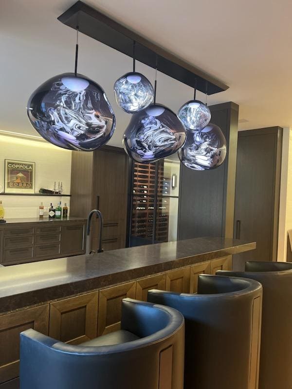 Renovated basement transformed into a stylish home bar with modern lighting and a sleek countertop