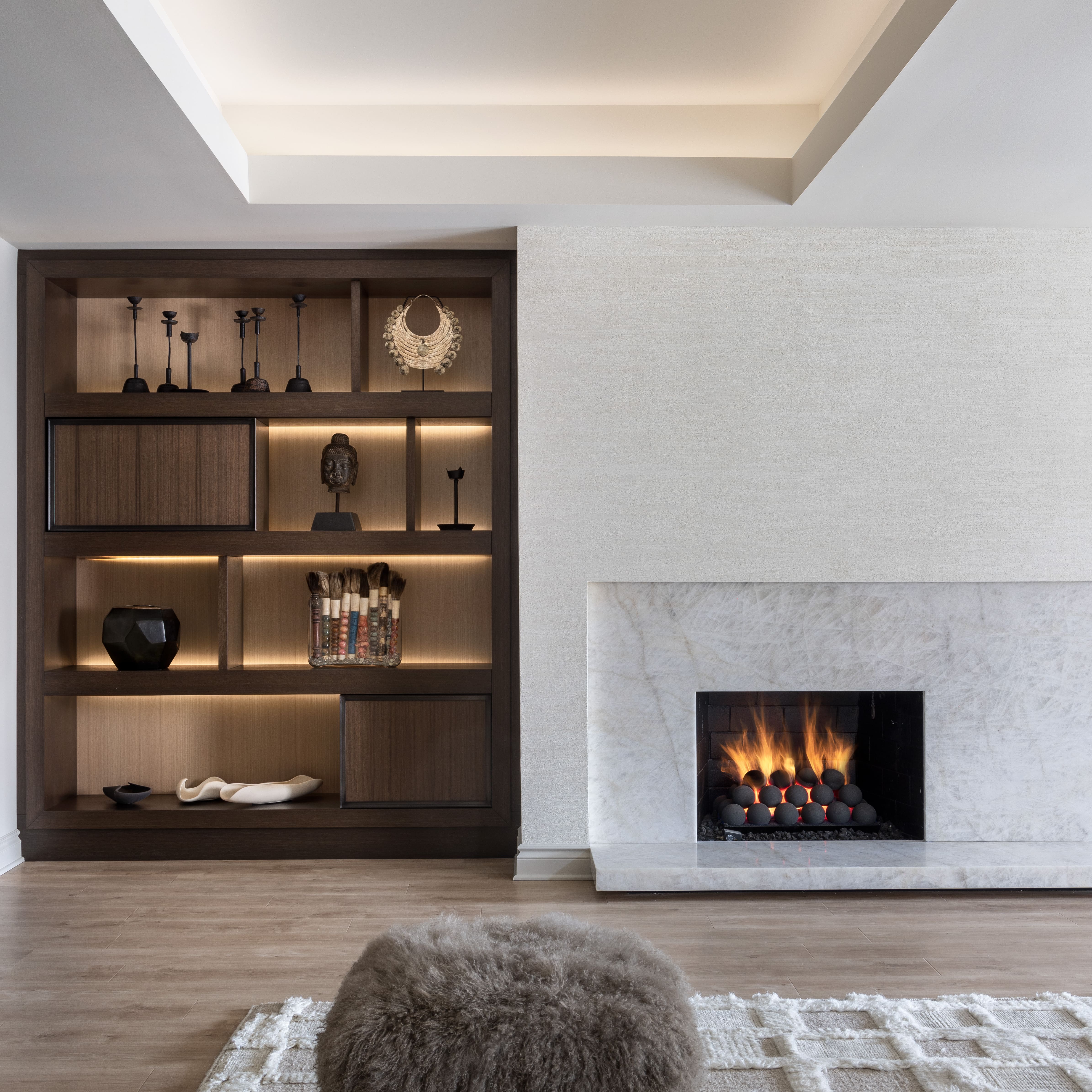 Renovated basement transformed into a living room with a fireplace