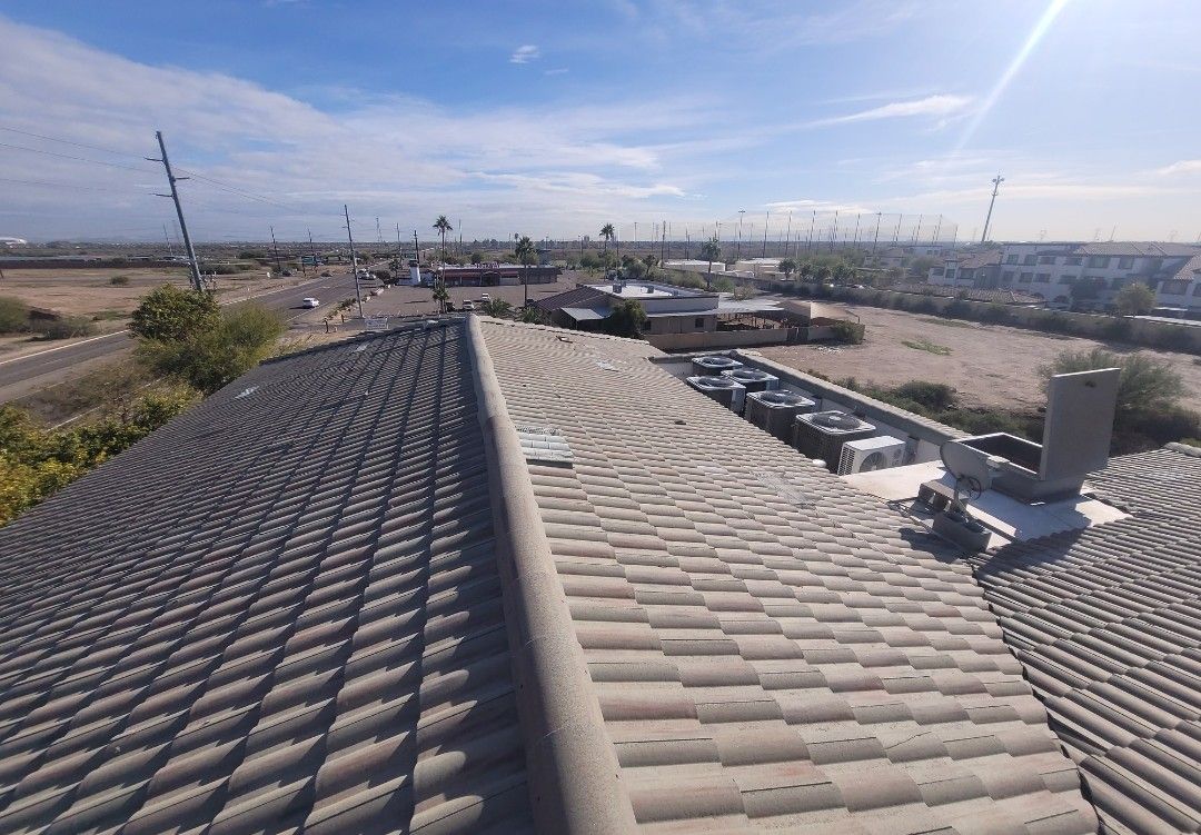 Commercial building rooftop with clay tile roofing and several HVAC units installed. Surrounding area shows roads, nearby buildings, and open desert landscape under bright sky.