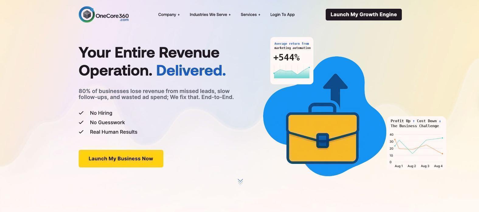 Landing page screenshot of OneCore360, Symmetriq.ai’s revenue operations system.
