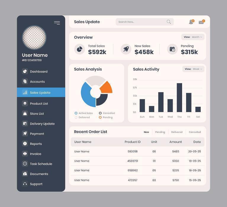 Sales performance dashboard showing KPIs, charts, and recent activity.