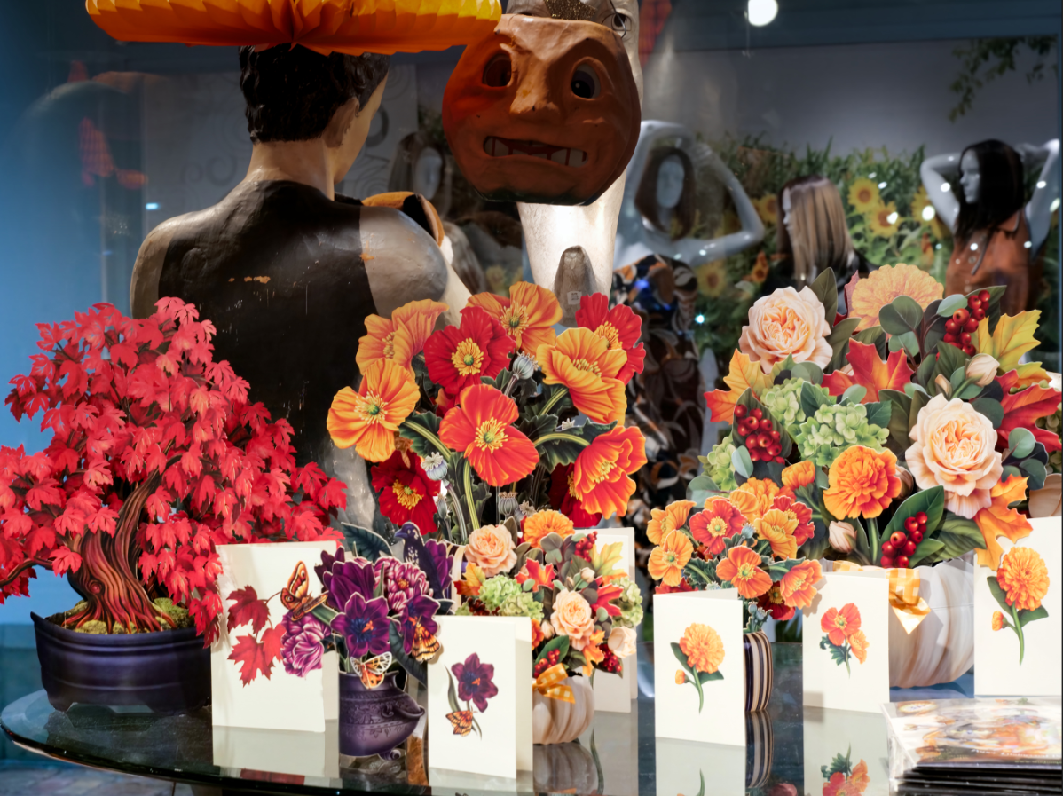 Immerse yourself in the artistic and festive spirit of Halloween with Tabula Rasa Social Stationers. This captivating display features a dramatic masked figure and a bold pumpkin mask, surrounded by an explosion of rich, autumnal paper flowers and a vibrant red paper tree. It's a celebration of seasonal color and unique artistry, perfect for inspiring a sophisticated and memorable Halloween decor.