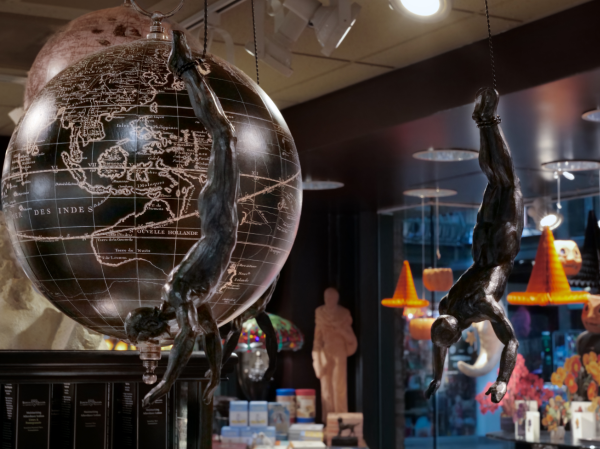 Step into a world of curious wonders this Halloween. This intriguing display features dynamic acrobatic figures suspended near a vintage-style globe, evoking a sense of mysterious, perhaps even haunted, circus performance. With a backdrop hinting at witches' hats and pumpkins, these unique pieces add an unexpected and sophisticated touch of eerie whimsy to your seasonal decor.