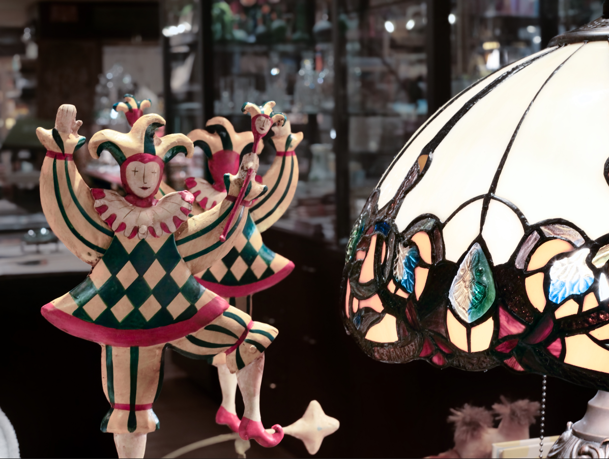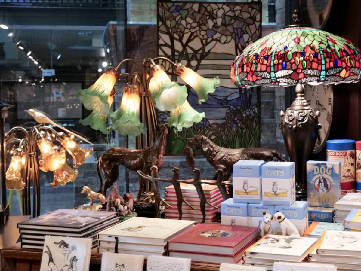 Peer into the mystical side of the season with our enchanting collection of curiosities. This display evokes a fortune teller's parlor, with Dog and Cat tarot decks ready for divination, spectral bronze hounds standing guard, and a warm, eerie glow cast by numerous Tiffany-style lamps. It's the perfect inspiration for creating a sophisticated, magical, and slightly spooky atmosphere in your own home this Halloween.