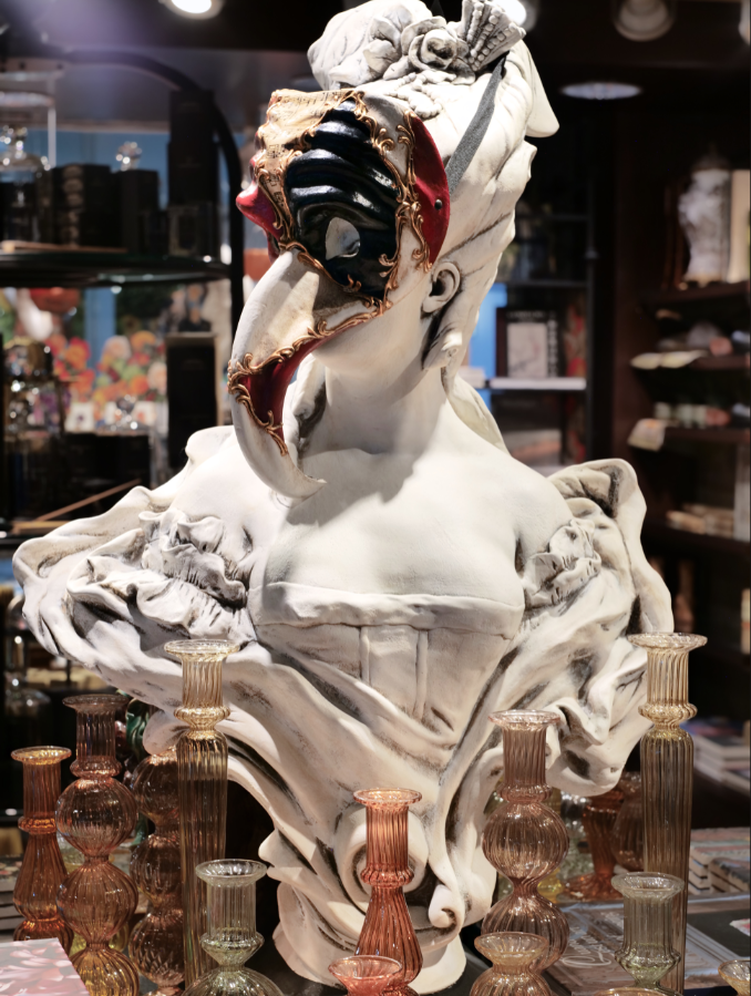 Embrace the drama of a gothic masquerade this Halloween. Our striking centerpiece, a classical bust adorned with an ornate Venetian plague doctor mask, creates an unforgettable statement of historical horror and dark elegance. Accompanied by an array of exquisite glass candlestick holders, it's the perfect inspiration for a sophisticated haunted banquet or an opulent seasonal display. Discover decor that is both breathtaking and bone-chilling.