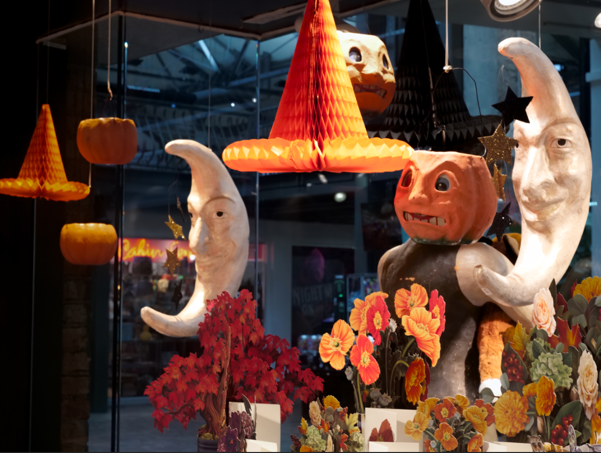 Immerse yourself in the enchanting spirit of Halloween at Tabula Rasa Social Stationers. Our festive window display captures a timeless, whimsical magic, featuring classic jack-o'-lantern characters, serene celestial moons, and festive paper decorations. Abundant autumn florals complete this charming scene, offering inspiration for a Halloween that is both playfully spooky and beautifully decorated.