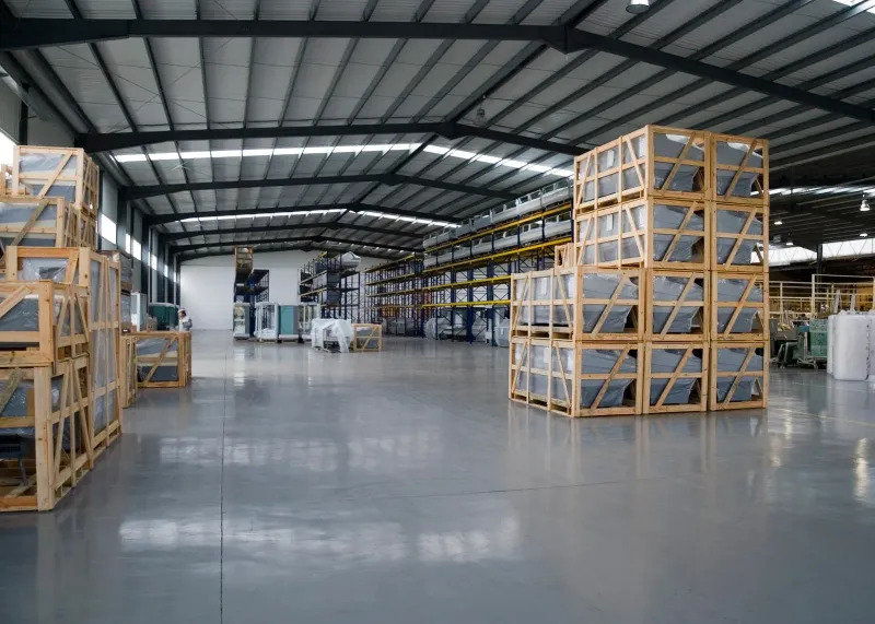 This wide-angle shot features a clean, expansive warehouse interior with polished concrete floors. Large wooden crates are stacked neatly in the foreground, while metal shelving units line the distant walls.