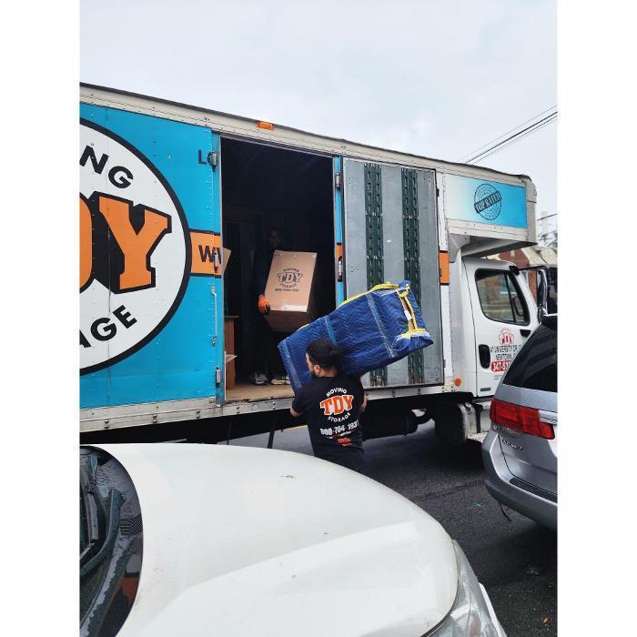 The exterior of the TDY Moving & Storage headquarters and storage warehouse facility in Brooklyn, NY, featuring large blue company signage and parked moving trucks.