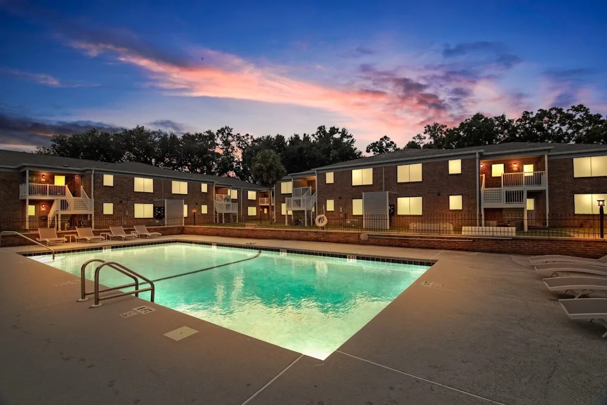 An apartment pool with a sunset in the background at dusk