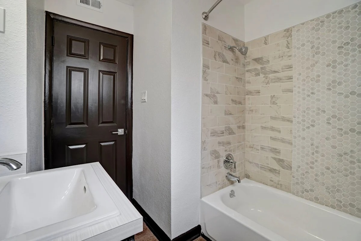 A bathroom with a tub and a sink and a door