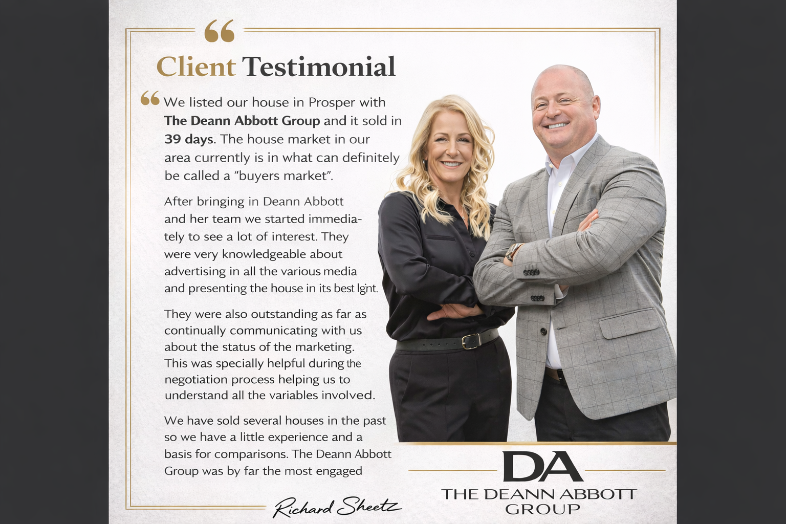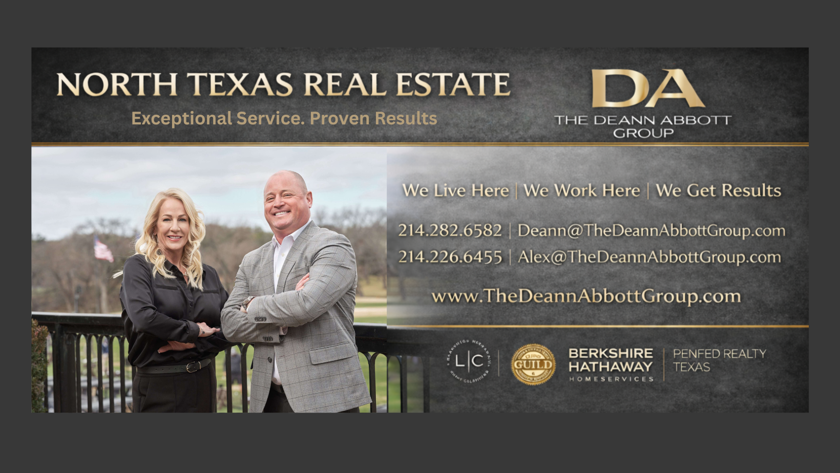 Deann Abbott, founder of The Deann Abbott Group, is a top-producing real estate agent serving Plano, Frisco, North Dallas, and Collin County. With 25+ years in North Texas real estate and over $100 million in closed sales in the past seven years, Deann is known for strategic pricing, innovative marketing, and strong negotiation for buyers and sellers. The team specializes in luxury homes, golf course communities, relocation, and new construction in neighborhoods including Willow Bend, Gleneagles, and West Plano. Whether buying, selling, or investing in the Plano luxury real estate market, Deann and business partner Alex Poole deliver personalized service, local expertise, and trusted results throughout Plano and the North Dallas area.