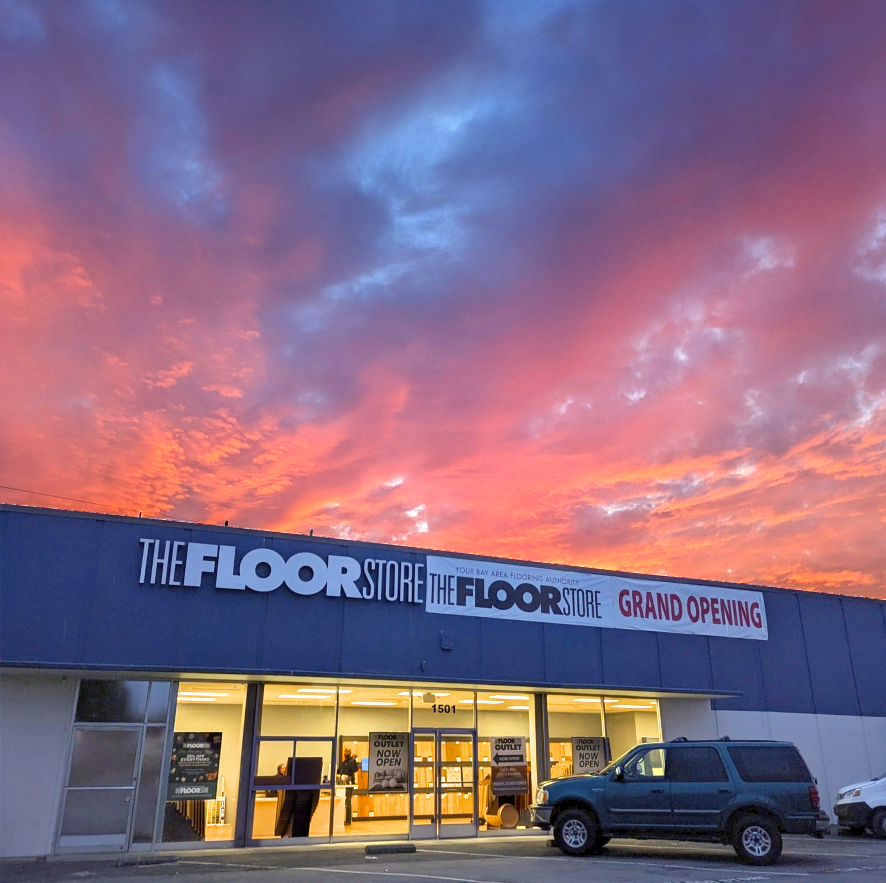 The Floor Store Outlet Burlingame during its grand opening event, captured under a vivid Bay Area sunset. Our newest flooring outlet offers 30% off storewide plus contractor discounts on hardwood, vinyl, laminate, and carpet.