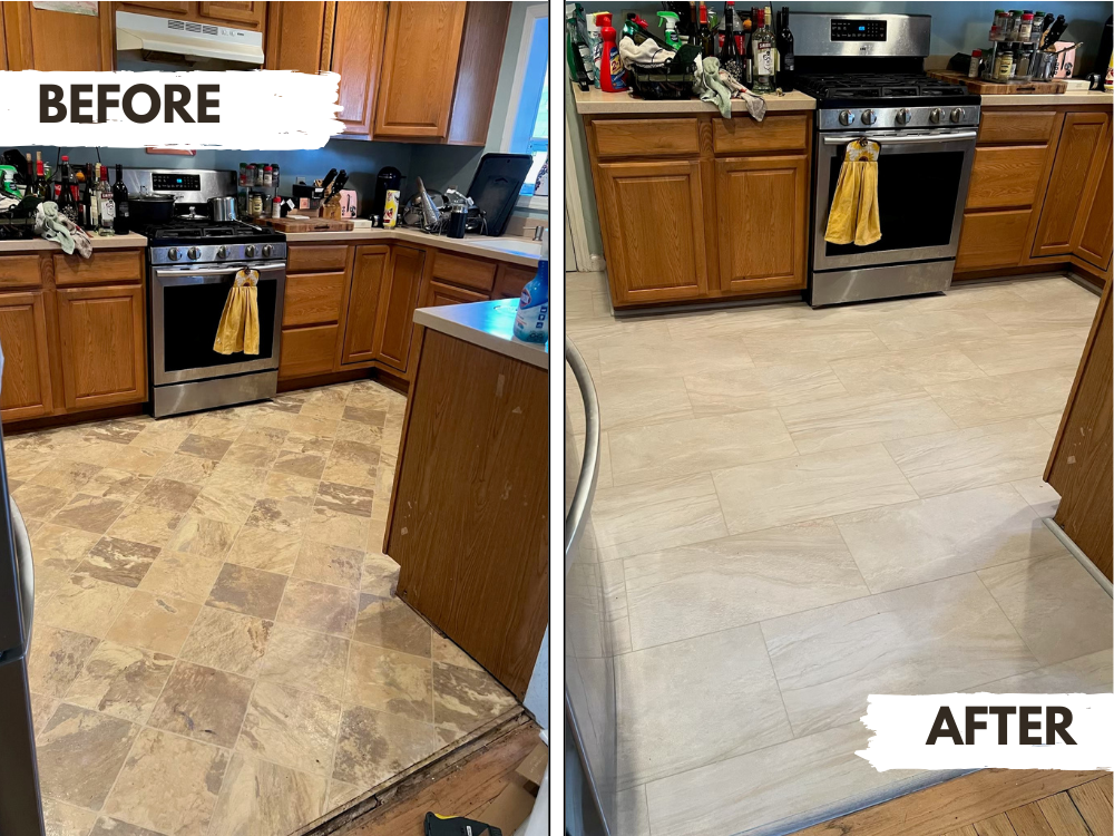 Before-and-after photos of a kitchen tile floor renovation by The Floor Store Outlet. The upgraded design delivers a cleaner, more modern look that brightens the space and enhances durability.