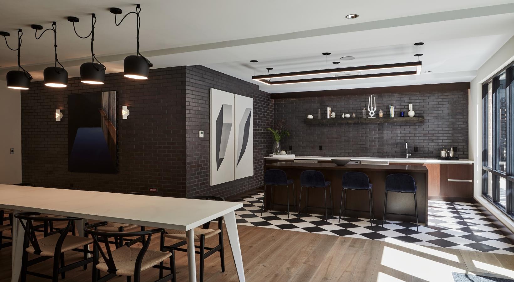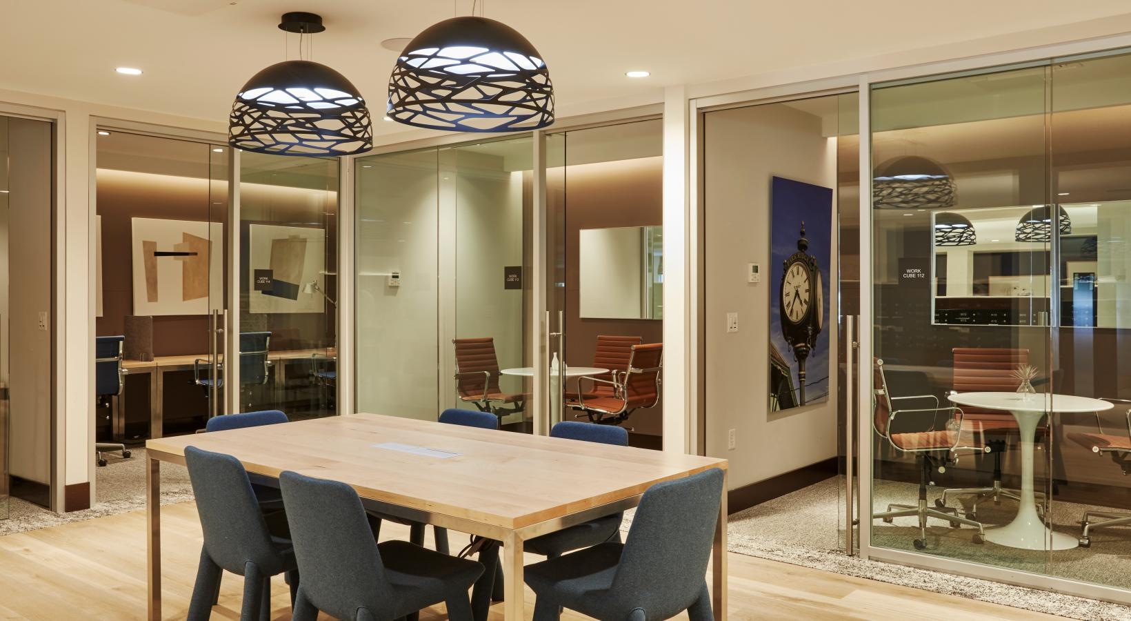 Co-working lounge with reservable private offices