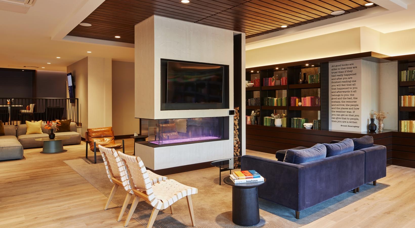 Lobby lounge with double-sided fireplace and seating