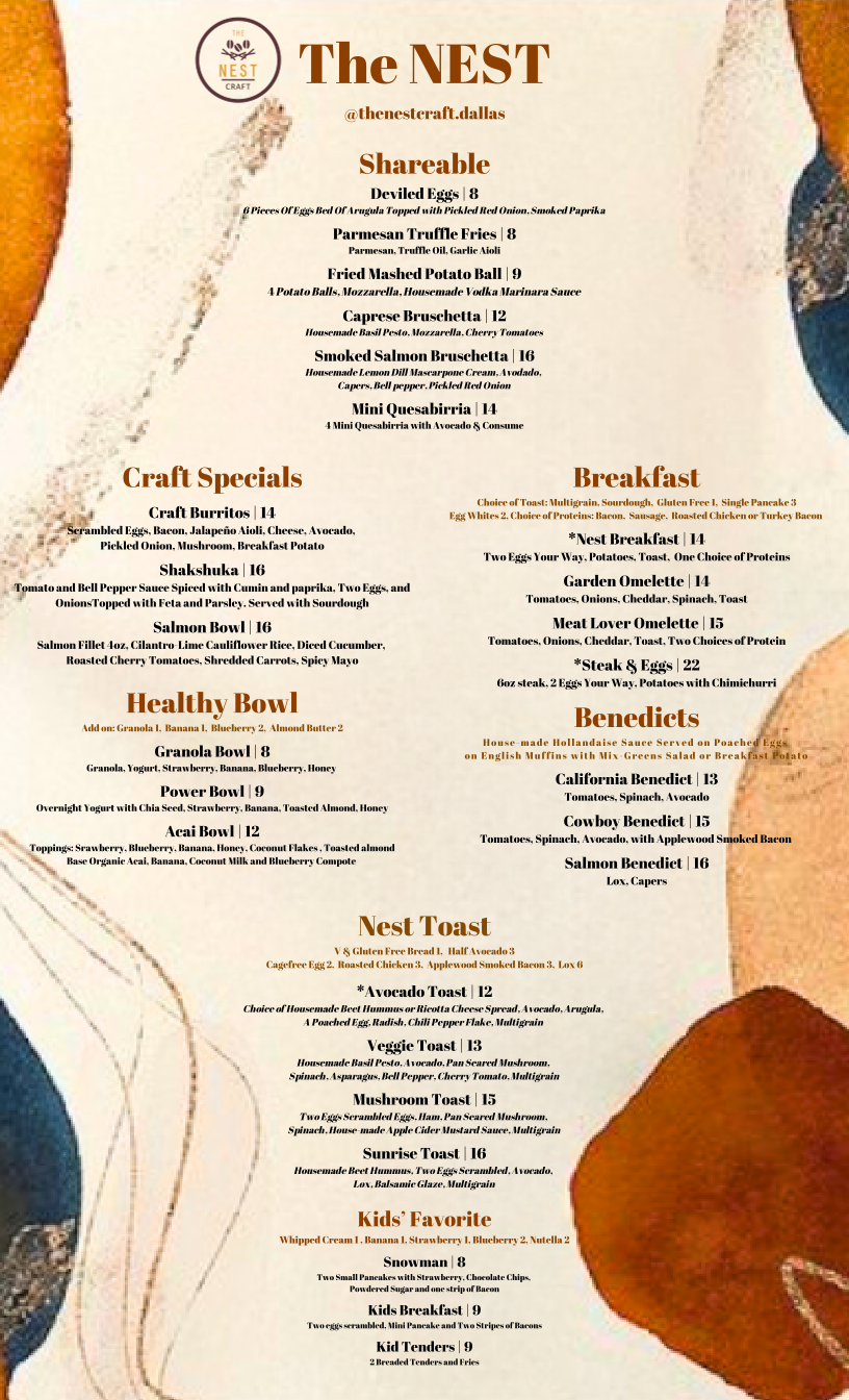 The Nest Craft is a farm-to-table American restaurant located in The Muse at Midtown in North Dallas. We serve a variety of options for brunch, lunch, and dinner. Our craft menu includes locally-sourced options including eggs benedict, acai bowls, french toast, salads, tacos, charcuterie boards, and much more. In a rush? Stop by in the morning for drip coffee, espresso, matcha lattes, cappuccinos, and more. Or join us for dinner Wednesday-Saturday and enjoy a classic or specialty craft cocktail. We are located behind Rug Studio, north of the Galleria Mall. *Parking is located in the parking structure on Muse Blvd in front of The Nest*