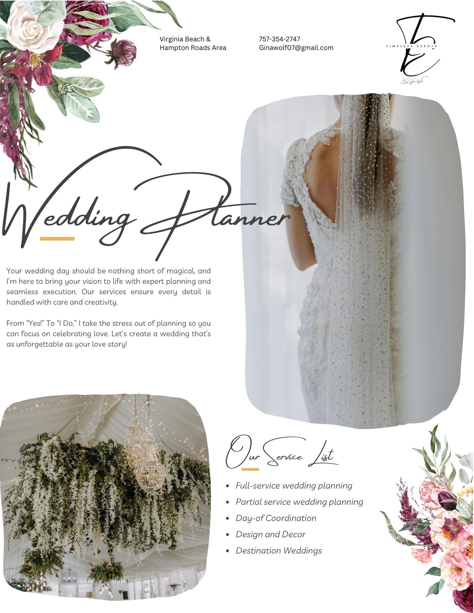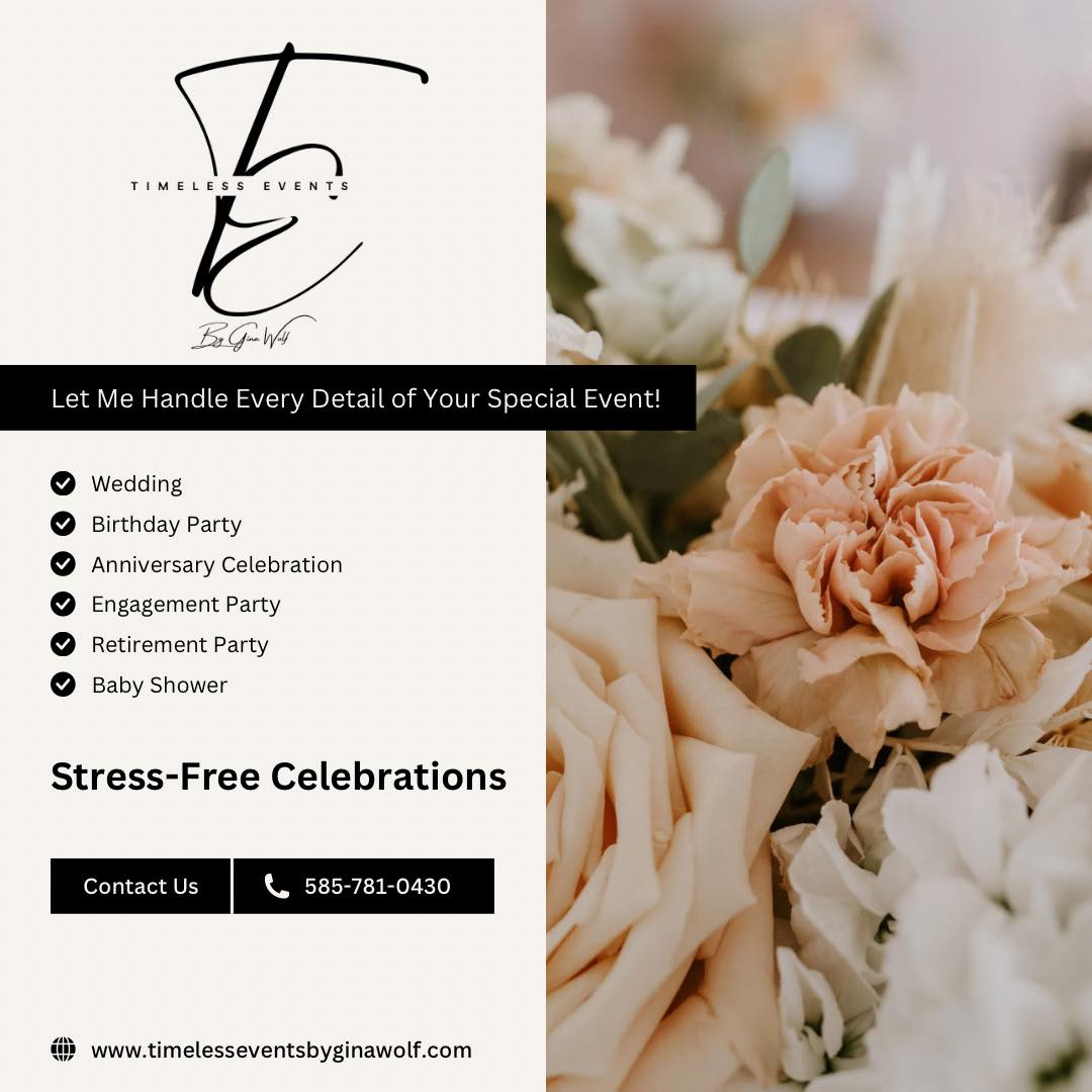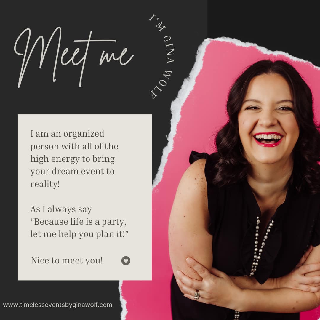 Timeless Events by Gina Wolf specializes in creating unforgettable celebrations that reflect your unique style and vision. With a passion for organization and a flair for creativity, Gina Wolf offers comprehensive event planning services for birthdays, anniversaries, corporate events, baby showers, bridal showers, and bachelorette parties. Serving the Virginia Beach and Hampton Roads area, Gina ensures each event is meticulously planned and executed, providing a seamless experience from start to finish. Whether you're celebrating a milestone or hosting a corporate gathering, trust Timeless Events by Gina Wolf to make your event truly special. Contact us today to start planning your timeless event.