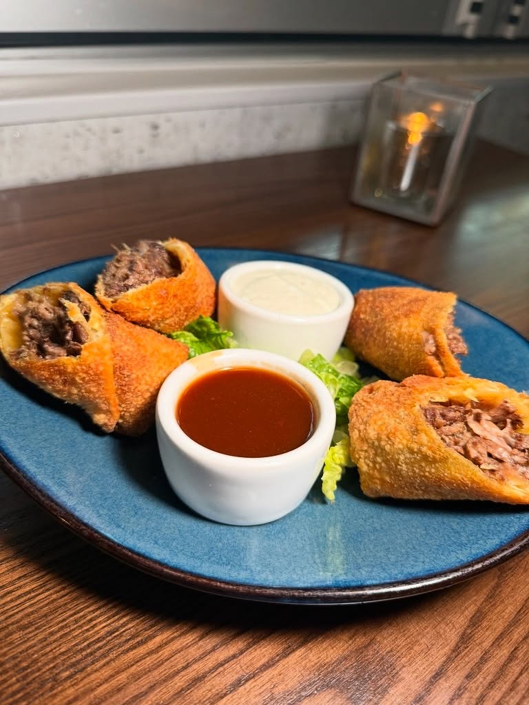 Short Rib Egg Rolls at Tonic Seafood & Steak in Wilmington, DE, filled with caramelized onions, provolone cheese, horseradish cream, and demi-glace.