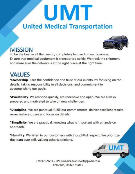 Established in 2024, United Medical Transportation has been facilitating the reliable and secure transportation of medical supplies in efficient, professional successions. Based in Denver, we also extend our vast services as a healthcare logistics provider to Colorado Springs, Boulder, and surrounding areas. From medical equipment delivery to functioning as a medical tools carrier, we excel in meeting the industry's needs. We remain committed to giving healthcare facilities the support they need to ensure medical infrastructure thrives. Partner with us today, and let us add value to your supply chain management system.