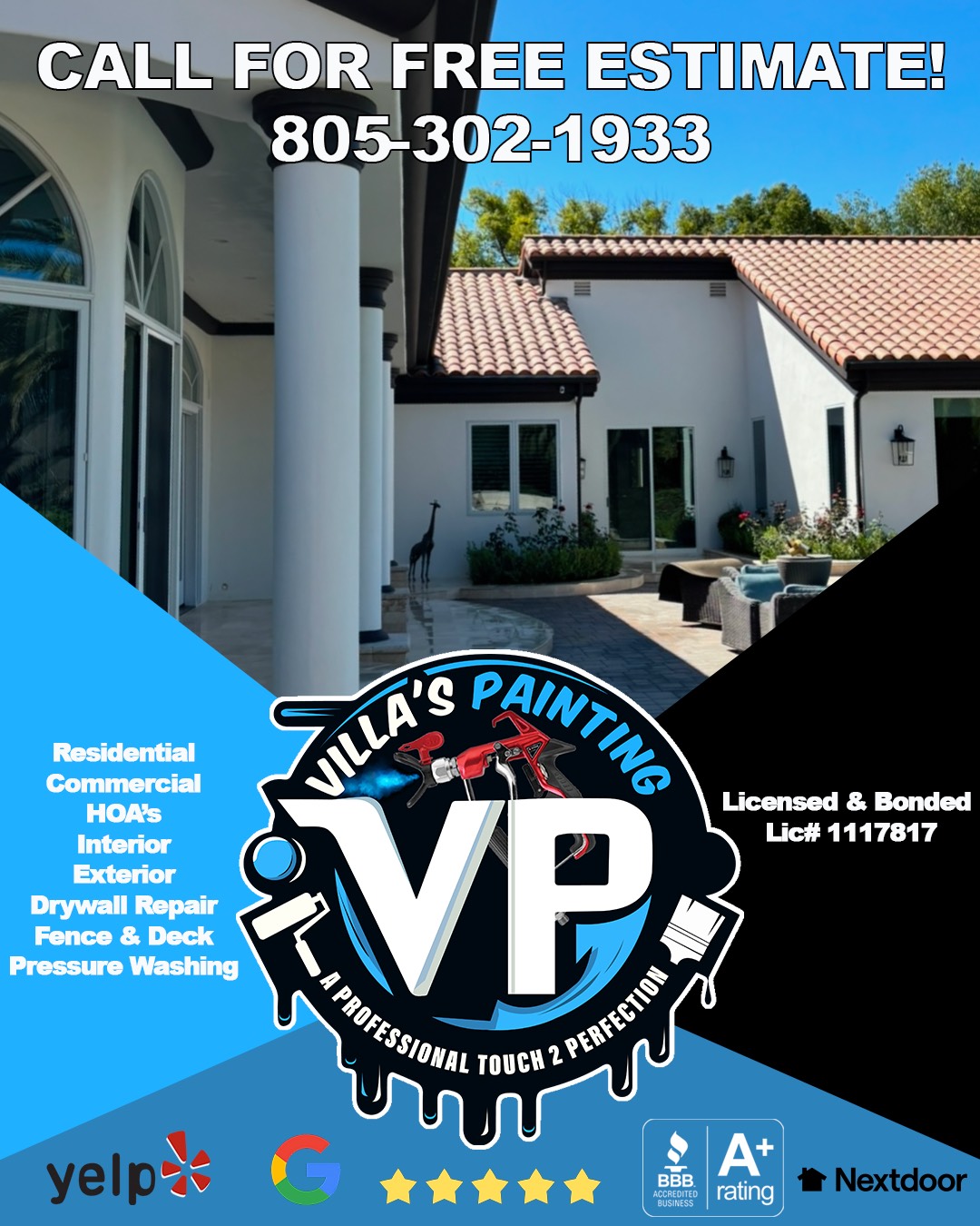 "Trust Villa’s Painting to transform your property with over 20 years of experience serving our community. Born and raised in the area, we take pride in providing personalized service and unmatched attention to detail for every project, whether residential or commercial. No job is too small—our skilled team is here to bring your vision to life with quality craftsmanship that lasts. Call us today to get started!"
