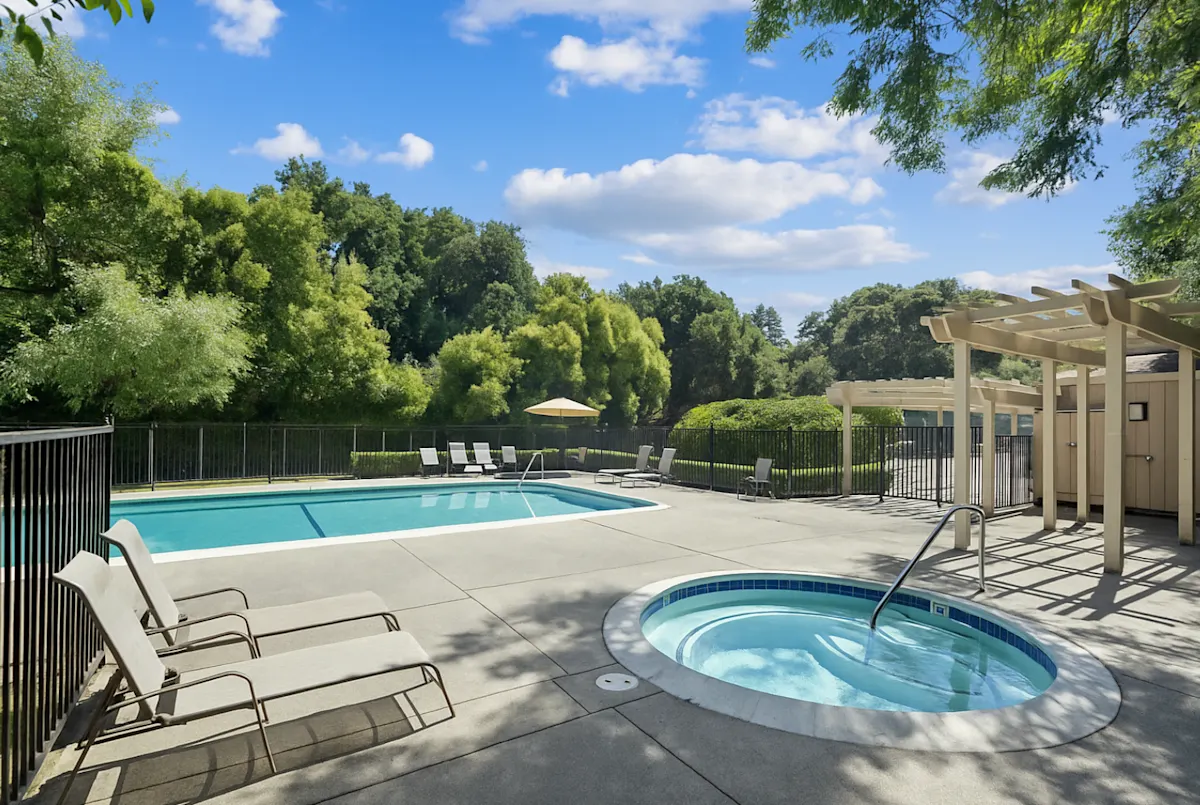 A pool with a hot tub and chairs in the foreground with trees in the background.