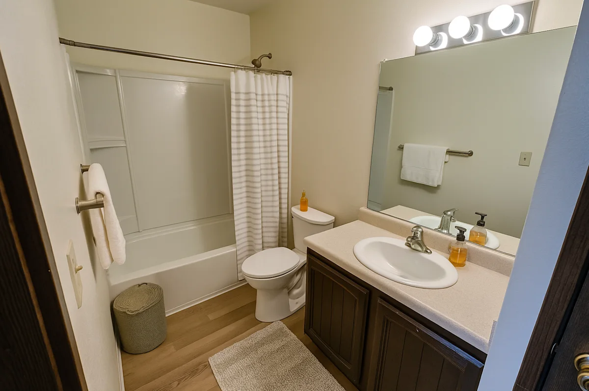 A bathroom with a toilet, sink, and shower.