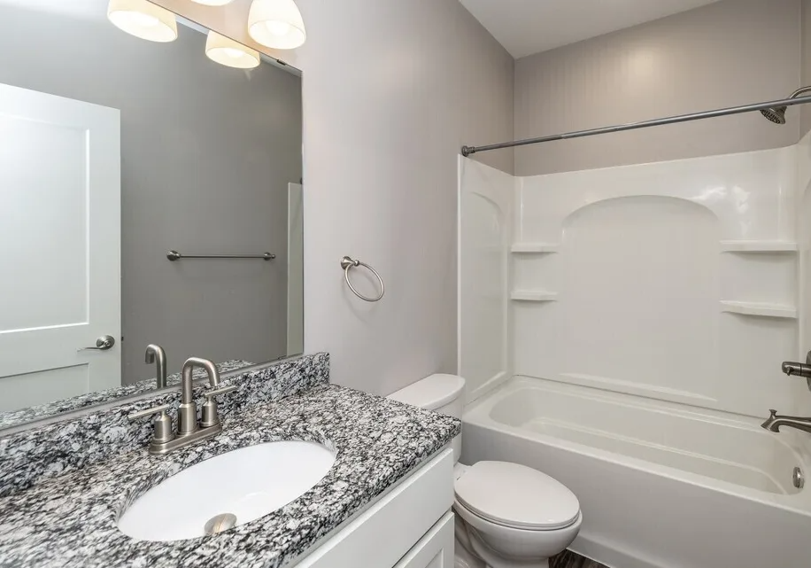 A bathroom with a granite countertop and white fixtures.