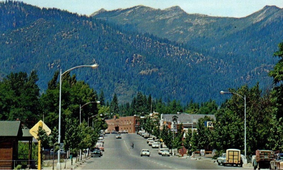 Downtown Weaverville, CA, framed by the towering mountains of the Trinity Alps, showcasing a vibrant Main Street lined with local businesses and everyday activity.